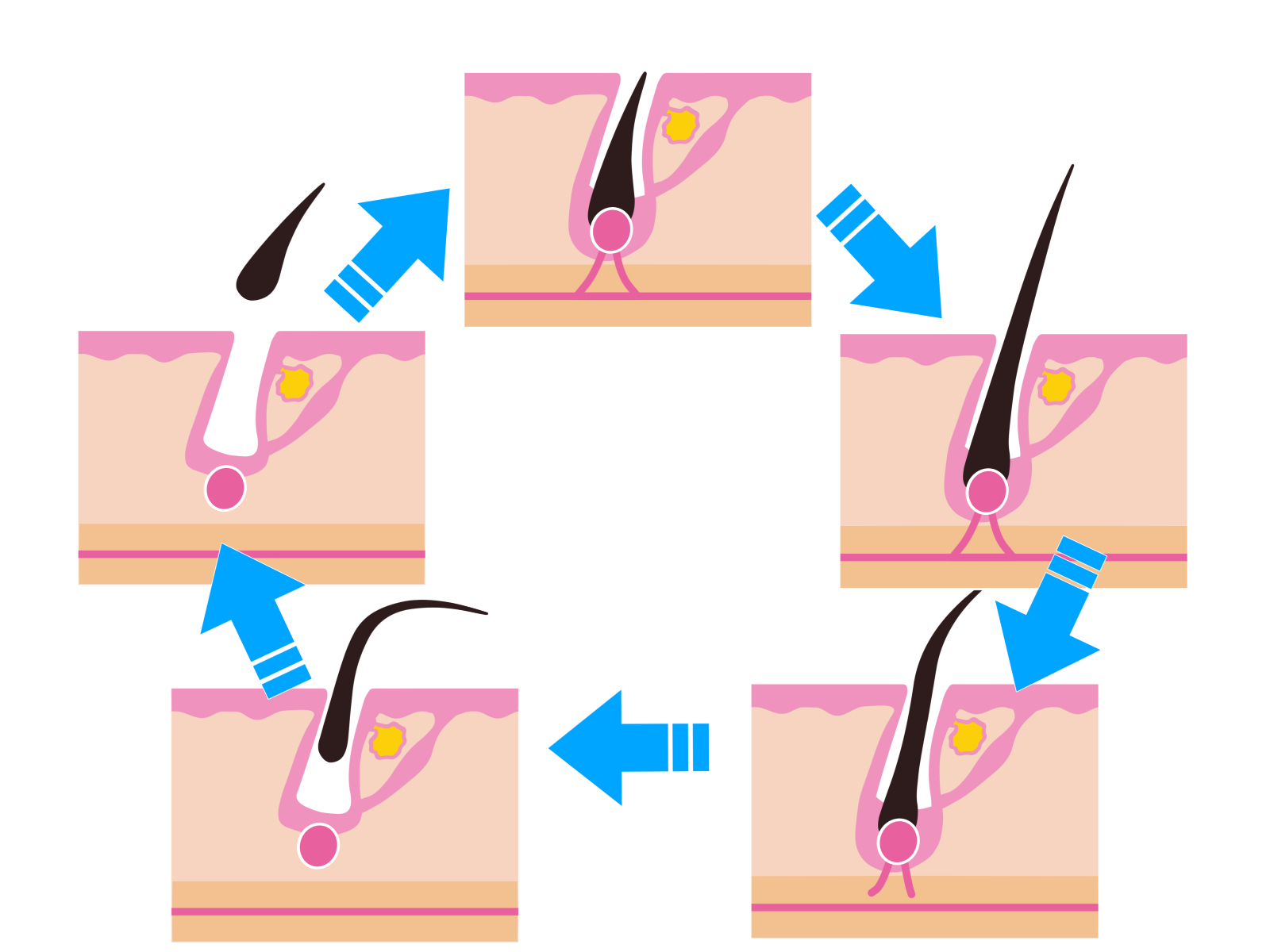 毛周期とは、毛が生まれてから抜け落ち、再び生えるまでの一連のサイクルのことを指します。すべての毛は常に同じ状態にあるわけではなく、部位ごとに異なるタイミングで成長しています。